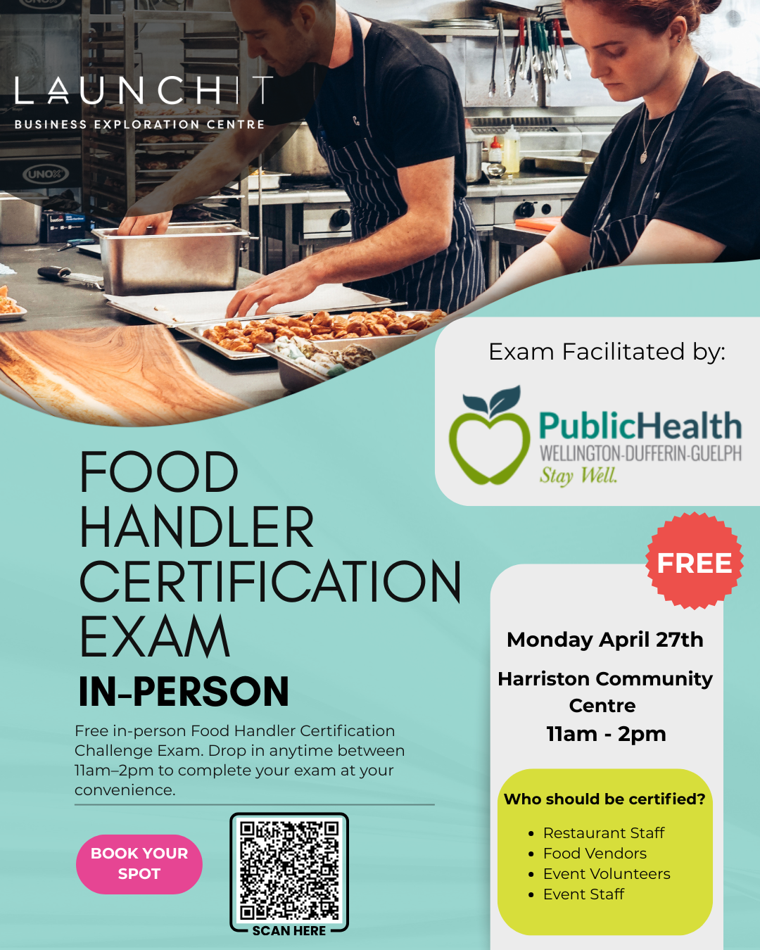 Whether you’re a local business owner, a food vendor, or a dedicated community volunteer, food safety is priority #1. To help you stay compliant and prepared, LaunchIt Minto & Public Health Wellington-Dufferin-Guelph is hosting a FREE in-person Food Handler Certification Exam!