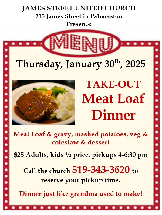 Best Meatloaf in Palmerston! Meatloaf, Mashed Potatoes, Veg, Coleslaw & dessert only $25 per adult, $10 kids under 12. Very popular dinner, comfort food at its best.